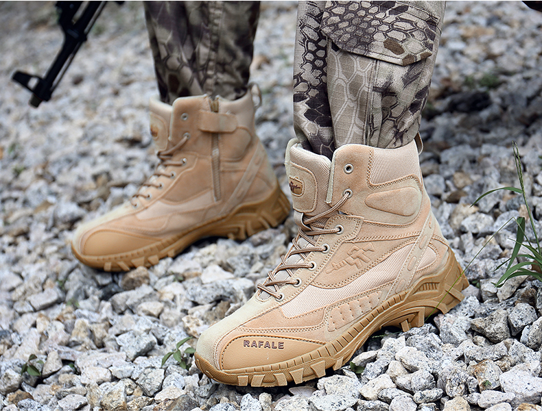 The upper of these men's combat boots is crafted from waterproof suede leather, ensuring durability and scratch resistance. The combat boots' outsole is made from lightweight rubber, and the curved edges of the outsole are seamlessly integrated with the uppers, enhancing the overall durability of these combat boots.