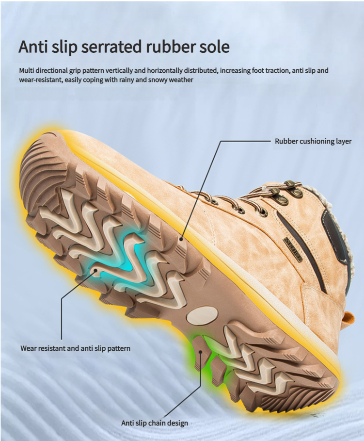 The sole of these boots features a serrated design crafted from high-quality rubber. This unique pattern significantly enhances the boot's anti-skid capabilities. Whether you're traversing slippery rocks, muddy trails, or wet surfaces, the serrations grip the terrain firmly, reducing the risk of slips and falls. It provides reliable traction on various terrains, allowing you to maintain a stable footing and move with confidence.